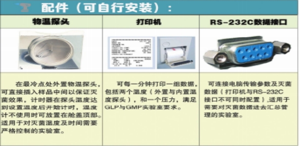 可以选配 带物温探头的打印机,实现1min间隔的实时灭菌温度及压力数据,监控灭菌效果的实时状态,为产品灭菌效果保驾护航。RS-232C 数据接口,选装后,就可以记录实时的灭菌温度的数据列表。