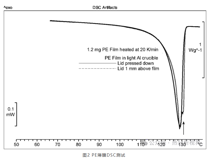 有时我们为了得到更好的分辨率或者为了避免薄膜样品测试过程中发生卷曲导致测试曲线异常(见图2),我们还可能用到20ul的轻质铝坩埚,坩埚与盖之间的狭小空间可以形成自生成气氛,在盖上提前打孔也可以使得坩埚内外气氛联通。