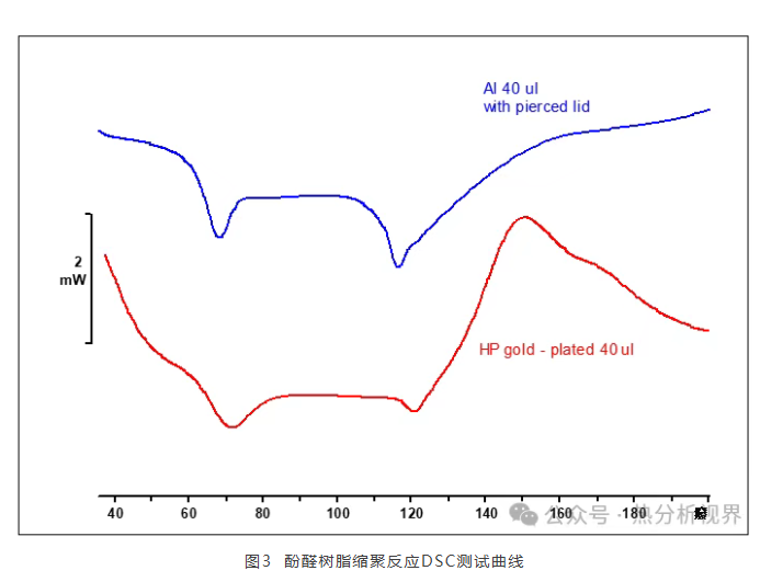 对于DSC来说不建议做到分解温度,因为分解产物一方面有可能会污染炉体和传感器,另一方面坩埚密闭内部压力过大有可能爆开坩埚盖子,导致测试结果不准确。对于某些特殊应用比如反应安全必须做到分解温度,我们可以选择高压坩埚。高压坩埚有重复使用(不锈钢30ul)和一次性(不锈钢镀金,25ul和40ul)的,如果追求测试结果准确性和重复性,建议使用一次性高压坩埚,相对成本较高,可避免重复使用高压坩埚多次使用后有可能的清洗残留和密封性减弱问题。对于阻止汽化且压力超过0.2Mpa的测试我们采用中压(耐压2Mpa)或者高压坩埚(耐压15Mpa)。下图3是酚醛树脂缩聚反应测试,由于DSC测试的是综合热效应,缩聚反应放热而水汽化吸热,采用40ul铝坩埚盖子扎孔测试根本测不到缩聚反应放热峰,而采用高压坩埚测试缩聚反应放热峰就很明显。