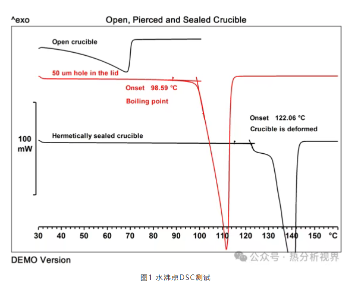 纯铝的熔点是660℃,实际使用的40ul铝坩埚熔点都低于660℃,有国产坩埚和进口坩埚之分,材质来源不同。进口坩埚质量均一,纯度高,可避免样品与坩埚杂质产生副反应,适用于常规DSC和低于640℃的TGA/DSC测试。对于比热和重复性测试来说,进口坩埚的效果更好。梅特勒-托利多铝坩埚高度低并且底部十分平坦(确保尽可能小的温度梯度),可用于固体和液体样品的测试。可以采用不扎孔盖子、50um孔盖子和大孔盖子三种形式密封达到不同的测试效果:完全密封耐压可达到0.2Mpa,可以用于抑制挥发性物质的吸热蒸发、汽化或升华(比如比热容和蛋白变形测试);50ul孔盖子采用激光打孔,能形成自生成气氛测试低沸点液体的沸点,同时还可以分离重叠的热效应;大孔盖子或者无盖可保持坩埚内的气氛和炉体气氛一致(比如氧化诱导期测试)。下图1是不同密封形式坩埚水汽化的测试,开口坩埚低温也有挥发吸热峰较宽,密闭坩埚在超过坩埚耐压极限爆开,爆开温度取决于样品量,50um孔的盖子能形成自生成气氛才能准确地测得水的沸点是98.59℃。40ul铝坩埚还有带定位针和不带定位针两种,不带定位针的适用于带自动进样器的仪器,带定位针的只能手动加样,可保证每次放置同样的位置,结果重复性较好。