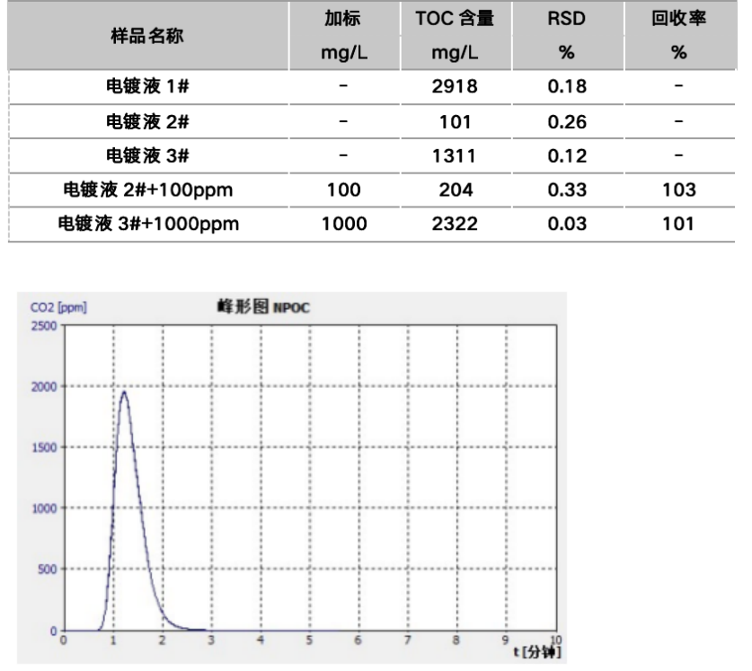 对3个电镀液样品进行直接测定,同时电镀液2#和电镀液3#做100ppm和1000ppm的加标回收率实验,从实验结果可以看出,结果重复性佳,电镀液2#和电镀液3的加标回收率为103%和101%,说明仪器对于高浓度的电镀液能准确测定,耐盐性好。