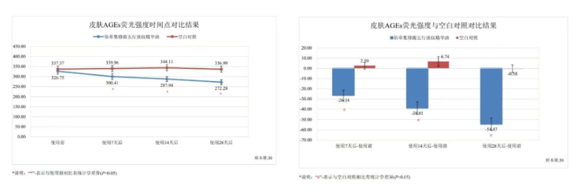 与使用前相比,皮肤AGEs荧光强度在连续使用样品7天、14天、28天后均显著降低(P<0.001)