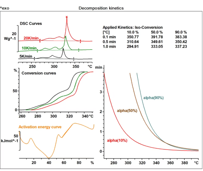 图3所示为按照特定比例混合NCM523正极材料、负极材料和电解液的测试曲线,样品被密封后使用DSC进行不同升温速率的测试。由于锂离子电池的成分较为复杂,导致分解过程分多步进行,因此,我们使用基于等转化率法的非模型动力学,得到随反应进度而变化的活化能曲线,右侧等转化率预测结果显示了体系达到特殊反应进度所需要的时间和温度。