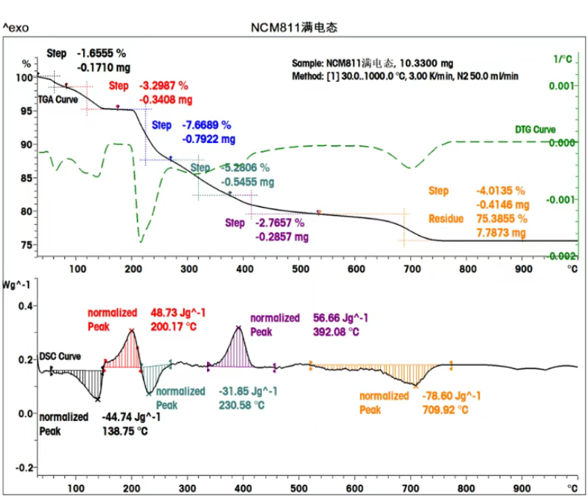 图4为使用同步热分析TGA/DSC3+对满电态三元正极材料的测试结果,充电后的三元材料在约200℃就发生了结构坍塌,之后伴随着分解反应,在DSC曲线上该过程显示为先放热后吸热。继续加热后又出现结构坍塌和三元材料的继续分解。